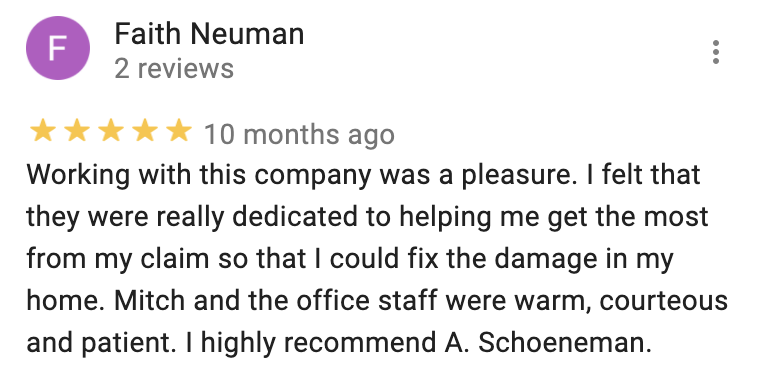 "These guys are the best. I just finished my insurance claim process and it was super easy, given all the expertise and knowledge that Mitch brought to the table. I didn't know how to navigate the insurance claim process, let alone that there are people like Mitch out there to help you with it. Mitch taught me what I needed to know and helped me every step of the way. Hopefully I don't have any future problems, but if I do, I will only call Mitch."